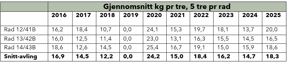 Avlingsnivået er høgt i feltet. Avlingsnivået i 2025 var eit av åra der avlinga er langt over snittet med 18,3 kg/tre som tilsvarar over 4500 kg/daa.